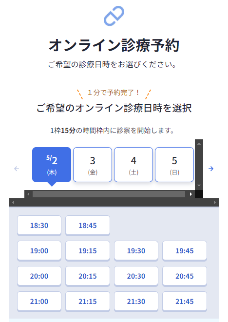こんな感じでスマホで希望電話時間を予約して、すぐにオンライン診療ができる。僕は15分後くらいで即日にした。予約画面はこのような感じで2分もあれば入力が完了できる。